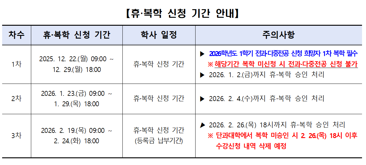 2026학년도 1학기 휴ㆍ복학 신청 기간 안내