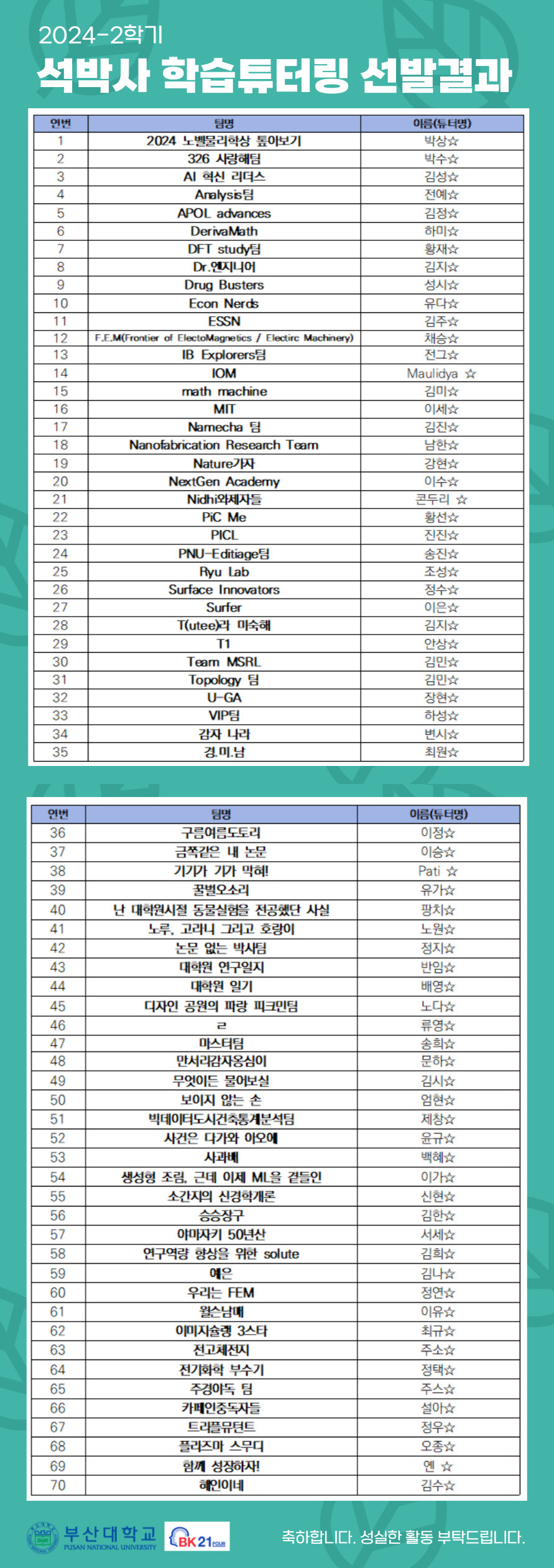 [선정/결과] 2024학년도 2학기 석박사 학습튜터링 선발결과
