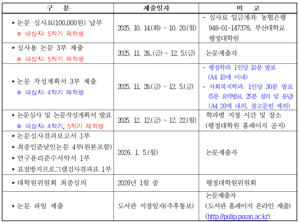 2025학년도 전기 행정대학원 석사과정 학위청구논문 심사계획을 붙임과 같이 알려드리니, 해당 학생들은 일정에 따라 진행하여 주시기 바랍니다.
