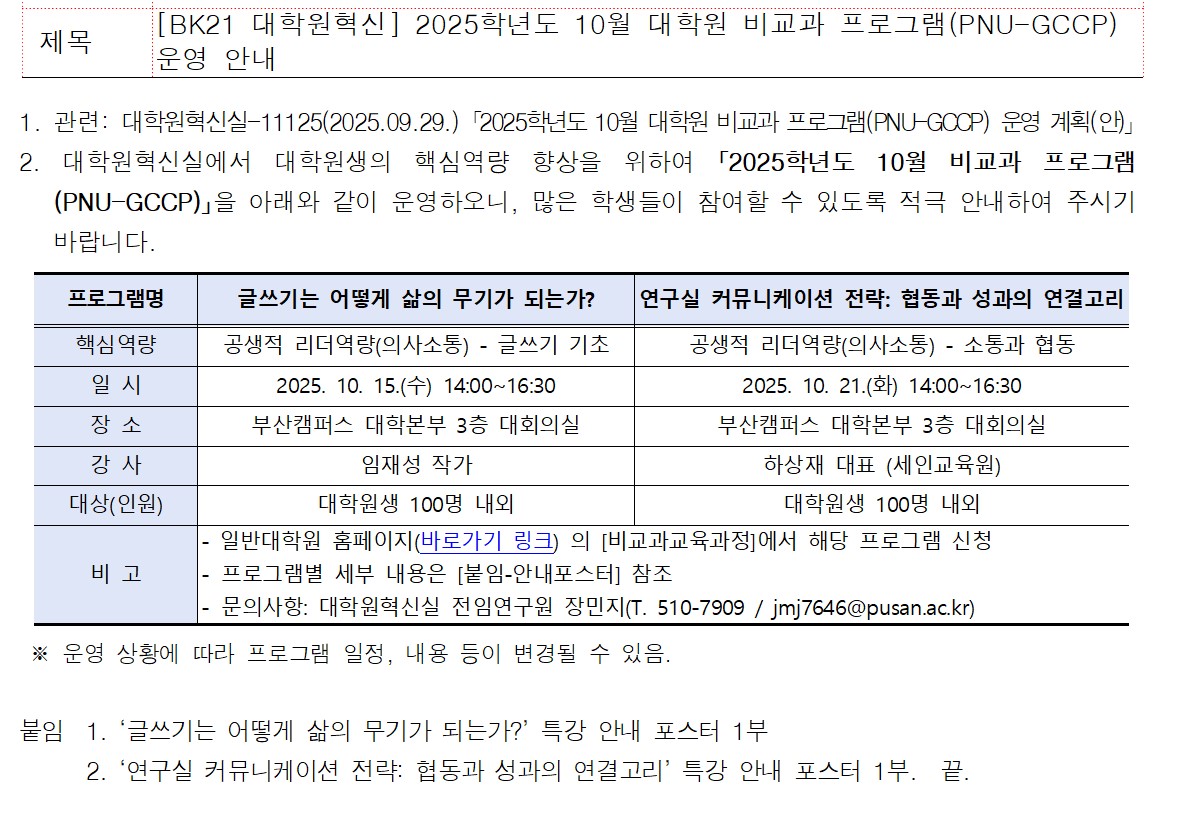 2025학년도 10월 대학원 비교과 프로그램(PNU-GCCP) 운영 안내
