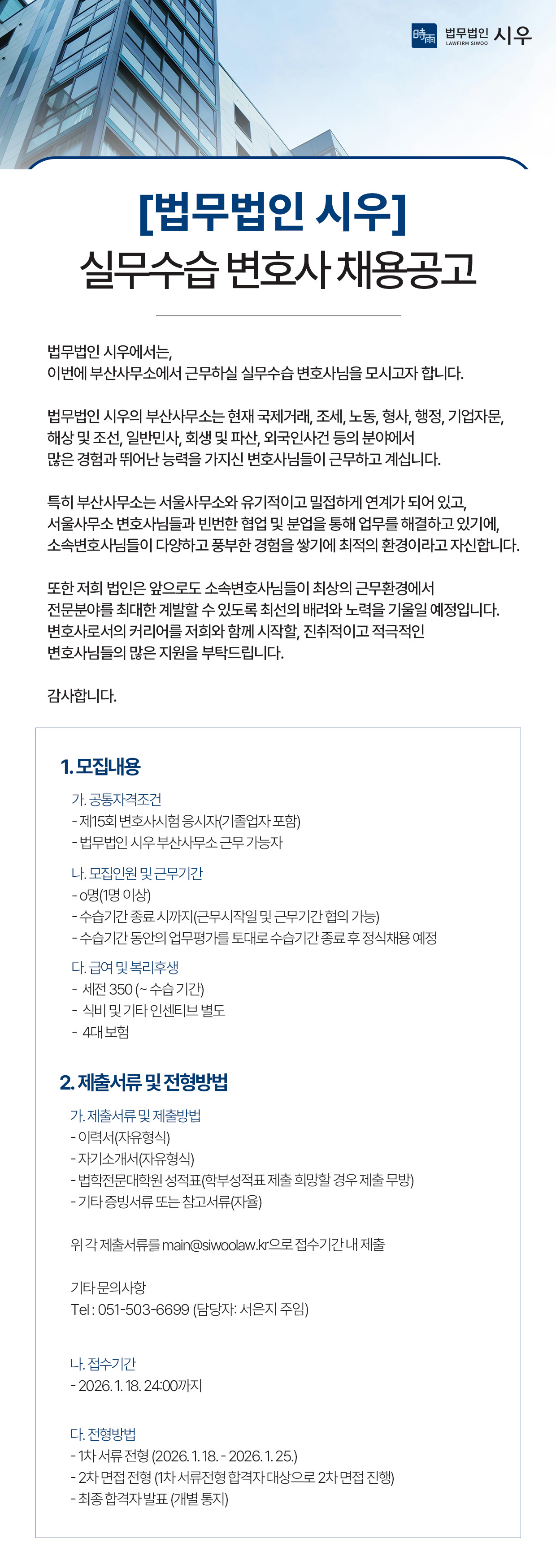 [취업-1393] 법무법인 시우 실무수습 변호사 채용공고(부산사무소, ~2026. 1. 18. 24:00)
