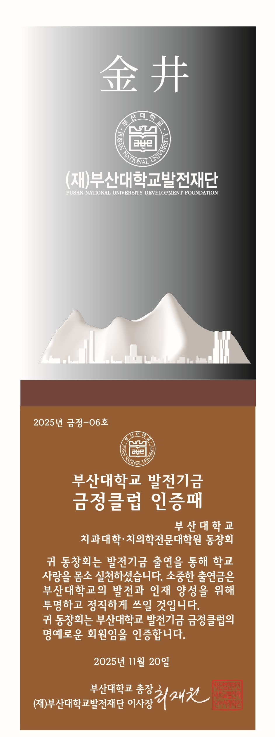 2025년 11월 20일, 부산대학교치과대학/치의학전문대학원 동창회에서 3억 원의 발전기금을 최재원 총장을 통해 부산대학교에