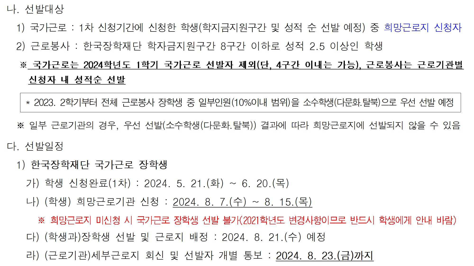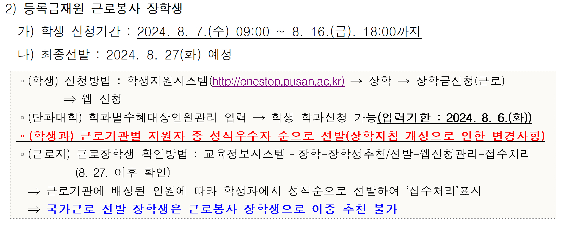 [장학_학사과정]2024학년도 2학기 국가근로 및 등록금재원 근로봉사 장학생 모집 안내