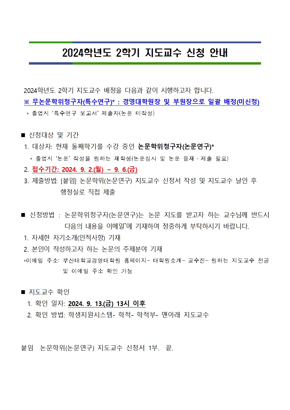 fnctId=bbs,fnctNo=3507 작성일 2024.08.06 수정일 2024.08.06 작성자 김희경 조회수 501 2024학년도 2학기 지도교수 신청 안내(논문학위청구자만 신청) 첨부파일 [서식]논문학위(논문연구) 지도교수 신청서.hwp 미리보기