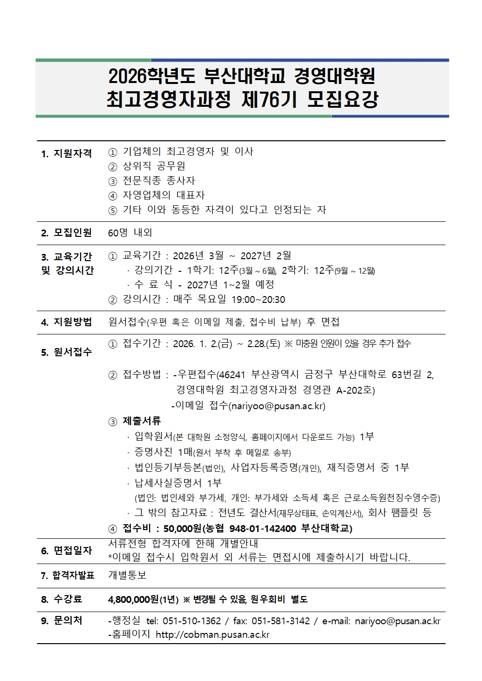fnctId=bbs,fnctNo=3509 작성일 2025.12.29 수정일 2025.12.29 작성자 유나리 조회수 38 2026학년도 최고경영자과정(AMP) 제76기 모집 ※ 아래 첨부되어 있는 "브로슈어"와 "76기 원서" 파일을 다운받으시기 바랍니다. 첨부파일 76기 원서.hwp 미리보기 2026 AMP 브로슈어(홈페이지 게시용).pdf 미리보기