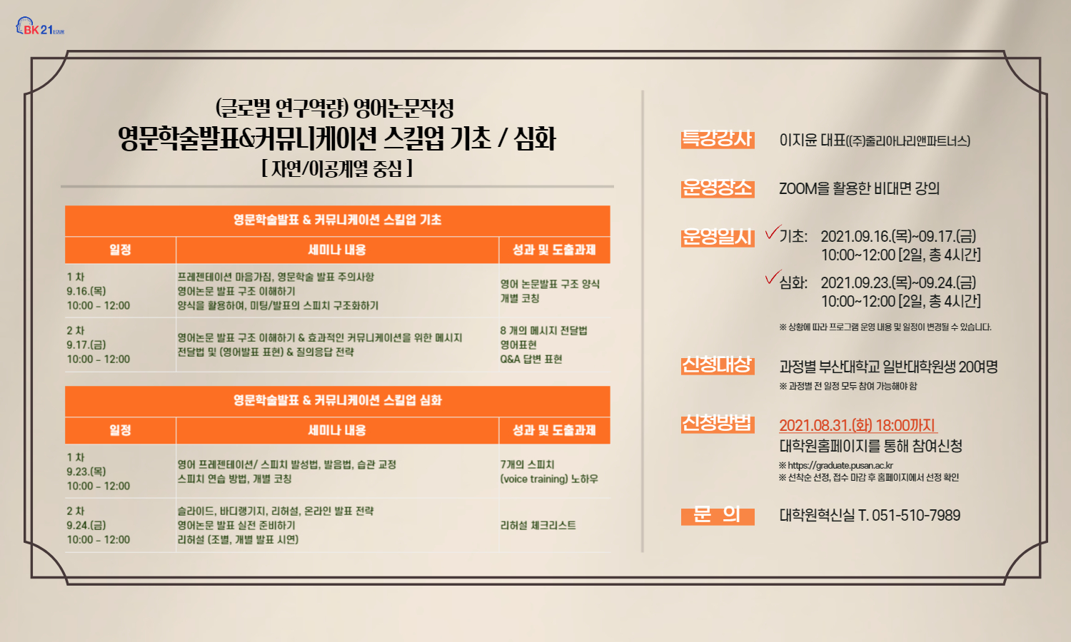 fnctId=program,fnctNo=7 [영어논문작성] 영문학술발표&커뮤니케이션 스킬업 기초/심화 온라인 모집대상부산대 대학원생 학년/성별전학년(재학생)/ 전체성별 대상학과자연/이공계열 마일리지3 점 첨부파일 영어학술발표&커뮤니케이션 스킬업 심화 날짜 2021.09.23 10:00 ~ 2021.09.24 12:00 상태 접수중 영어학술발표&커뮤니케이션 스킬업 기초 날짜 2021.09.16 10:00 ~ 2021.09.17 12:00 상태 접수중 개인정보 수집·이용 동의 동의 동의하지 않습니다. 프로그램 개요 공지사항 링크 핵심역량지수 프로그램 설명 - 해외 논문 기재 후 영어논문 학술발표 시 숙지해야 할 부분 안내 - 전문분야 논문, 연구 내용 등을 영어로 발표할 때 필요한 언어적/비언어적 전략 학습 등
