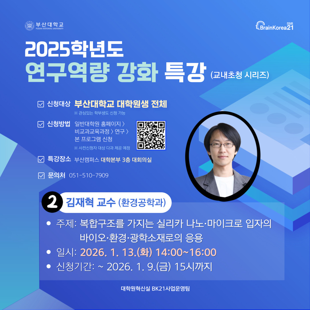 fnctId=program,fnctNo=6 2025 동계방학 연구역량 강화 특강(환경공학과, 김재혁 교수님) 오프라인 모집대상본교 대학원생 전체 학년/성별/ 전체성별 대상학과 마일리지1 점 첨부파일 2025 연구역량 강화 특강(환경공학과, 김재혁 교수님) 날짜 2026.01.13 14:00 ~ 2026.01.13 16:00 상태 접수중 개인정보 수집·이용 동의 동의 동의하지 않습니다. 프로그램 개요 공지사항 링크 핵심역량지수 프로그램 설명 * 주제: 복합구조를 가지는 실리카 나노·마이크로 입자의 바이오·환경·광학 소재로의 응용