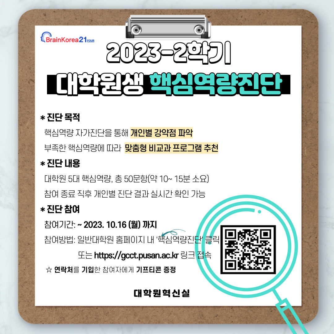 [BK21 대학원혁신] 2023학년도 2학기 대학원생 핵심역량 진단 실시 안내(~10/16)