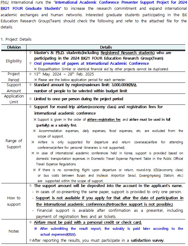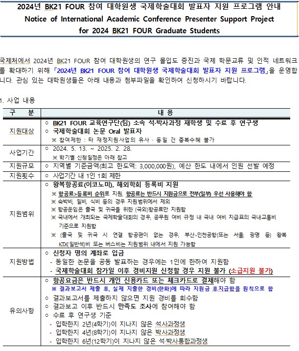 [BK21] 2024년 BK21 FOUR 참여 대학원생 국제학술대회 발표자 지원 프로그램 안내/ Notice of International Academic Conference Presenter Support Project for 2024 BK21 FOUR Graduate Students