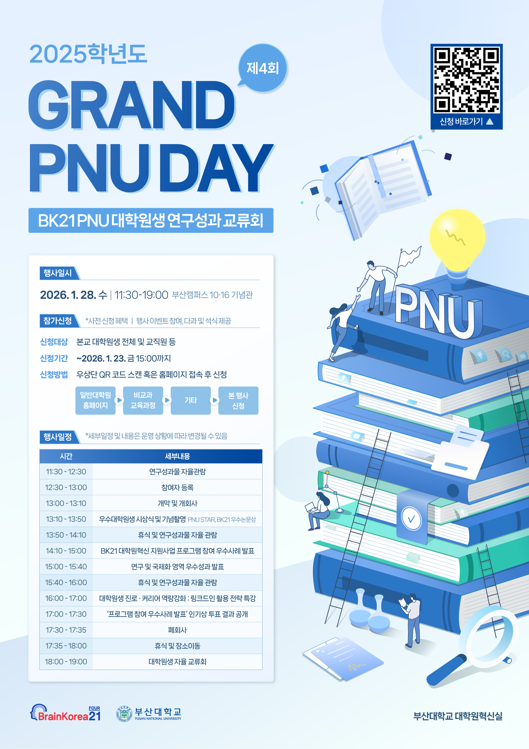 fnctId=program,fnctNo=3 2025학년도 BK21 PNU 대학원생 연구성과 교류회: 제4회 GRAND-PNU Day 오프라인 모집대상본교 대학원생 전체 및 교직원 등 학년/성별/ 전체성별 대상학과 마일리지5 점 첨부파일 2025학년도 BK21 PNU 대학원생 연구성과 교류회: 제4회 GRAND-PNU Day 날짜 2026.01.28 12:00 ~ 2026.01.28 19:00 상태 접수중 개인정보 수집·이용 동의 동의 동의하지 않습니다. 프로그램 개요 공지사항 링크 핵심역량지수 프로그램 설명 1. 우수대학원생 시상식(PNU-STAR, BK21 우수논문상) 2. 영역별 프로그램 우수성과 발표 3. 대학원생 진로·커리어 역량 강화: 링크드인 활용 전략 특강 4. 2025학년도 연구성과 발표 영상 온라인 자율관람 및 대학원생 자율 교류회