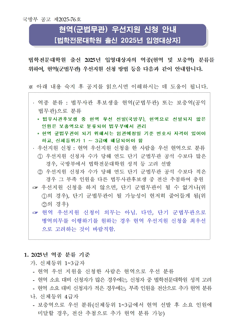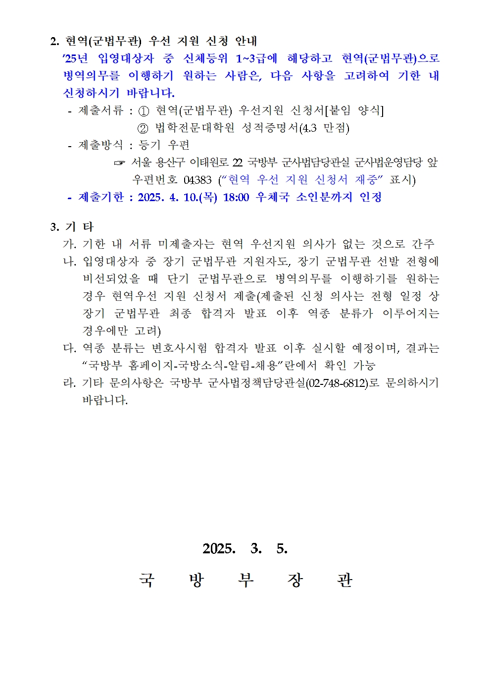 fnctId=bbs,fnctNo=3874 현역(단기 군법무관) 우선지원 신청 안내 date 2025.03.12 name 박지현 e-mail view 225 첨부파일 붙임 1. 국방부 공고문.hwp 미리보기 붙임 2. 지원서 등 양식.hwpx