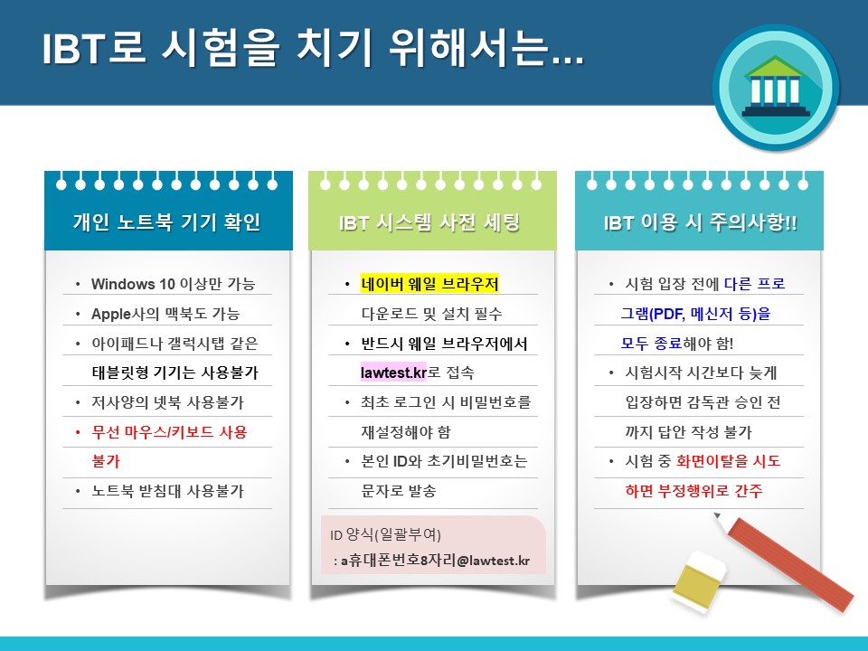 fnctId=bbs,fnctNo=3874 [신입생 필독!!] IBT(Internet Based Test) 사용 안내문 date 2025.03.13 name 허진비 e-mail view 524 첨부파일 첨부파일이(가) 없습니다.