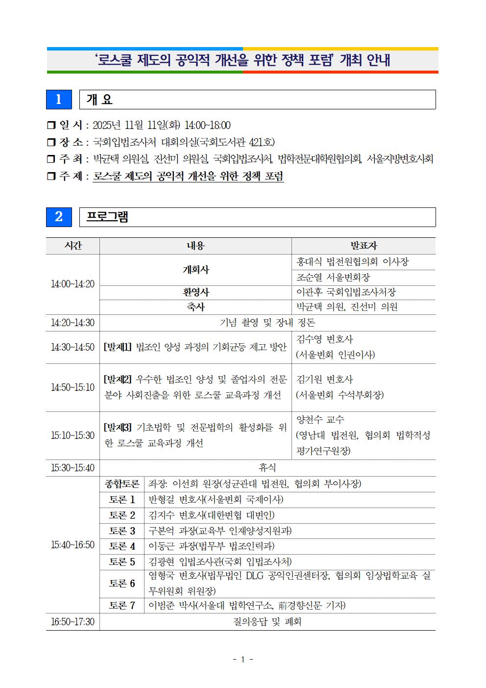 fnctId=bbs,fnctNo=3874 [법학전문대학원협의회] 2025년 <로스쿨 제도의 공익적 개선을 위한 정책 포럼> 개최 안내(학생 참가 가능, 11/11 화) date 2025.10.29 name 법학전문대학원 e-mail view 44 첨부파일 [붙임] 로스쿨 제도의 공익적 개선을 위한 정책 포럼 개최 일정.hwp 미리보기