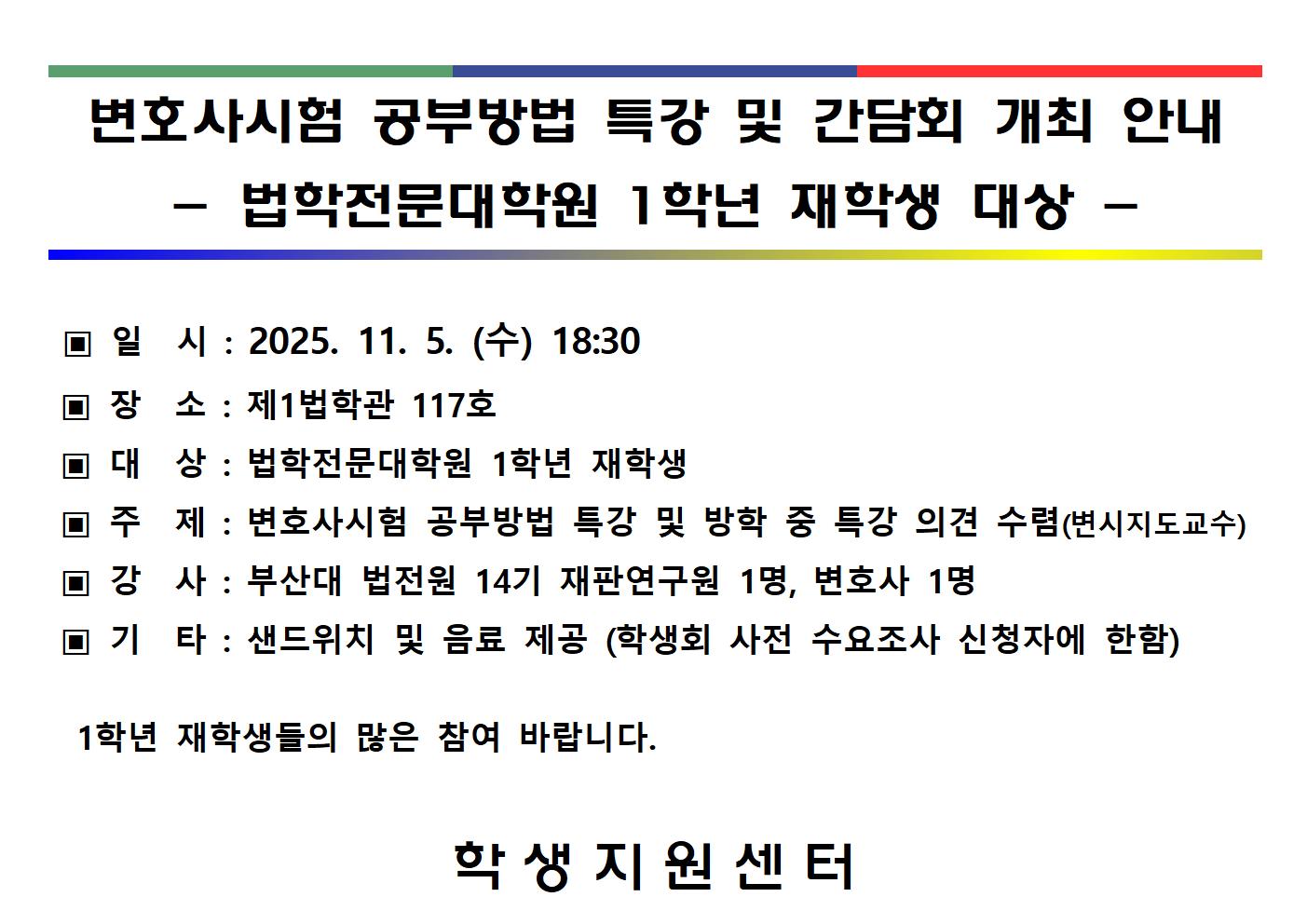 fnctId=bbs,fnctNo=3874 [1학년 대상] 2025학년도 2학기 변호사시험 공부방법 특강 및 간담회 개최 안내(11/5 수, 18:30, 117호) date 2025.11.05 name 법학전문대학원 e-mail view 132 첨부파일 첨부파일이(가) 없습니다.