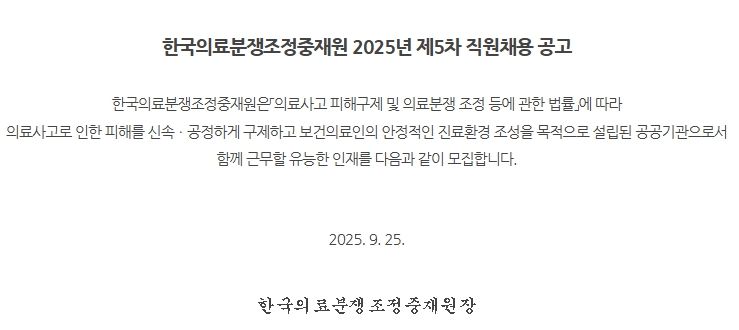 fnctId=bbs,fnctNo=3876 [취업-1382] 2025년 제5차 한국의료분쟁조정중재원 직원 채용공고(심사직 다급, ~10/14 화 18:00) date 2025.09.29 name 법학전문대학원 e-mail view 26 첨부파일 [공고 제2025-18호] 한국의료분쟁조정중재원 2025년 제5차 직원채용 공고.pdf 미리보기 직무기술서 일체(2025년 제5차 직원채용).zip