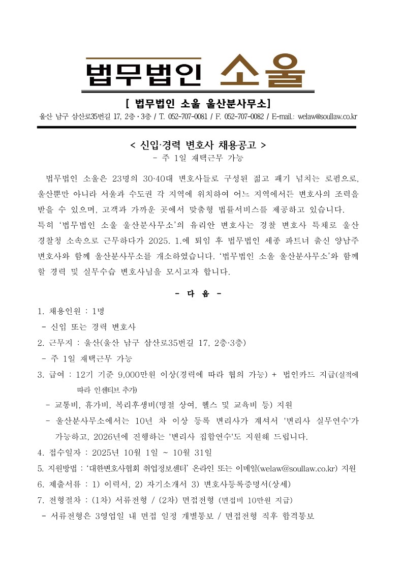 fnctId=bbs,fnctNo=3876 [취업-1383] 법무법인 소울 신입/경력 변호사 채용공고(울산, ~10/31 금) date 2025.09.30 name 법학전문대학원 e-mail view 88 첨부파일 050929_법무법인 소울_신입및경력채용공고_공고문.pdf 미리보기