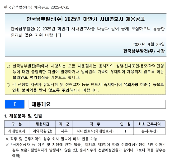 fnctId=bbs,fnctNo=3876 [취업-1385] 한국남부발전(주) 2025년 하반기 사내변호사 채용공고(부산, ~10/14 화 11:00) date 2025.10.01 name 법학전문대학원 e-mail view 85 ※ 자세한 사항은 첨부파일을 참조바랍니다. 첨부파일 한국남부발전(주) 2025년 하반기 사내변호사 채용공고.pdf 미리보기 직무기술서_사내변호사.pdf 미리보기