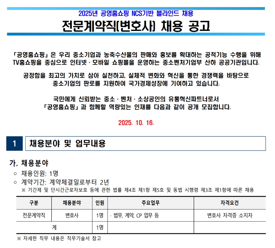fnctId=bbs,fnctNo=3876 [취업-1386] 2025년 공영홈쇼핑 전문계약직(변호사) 채용공고(~10/31 금 10:00) date 2025.10.17 name 법학전문대학원 e-mail view 17 첨부파일 공영홈쇼핑 채용공고문(변호사).pdf 미리보기