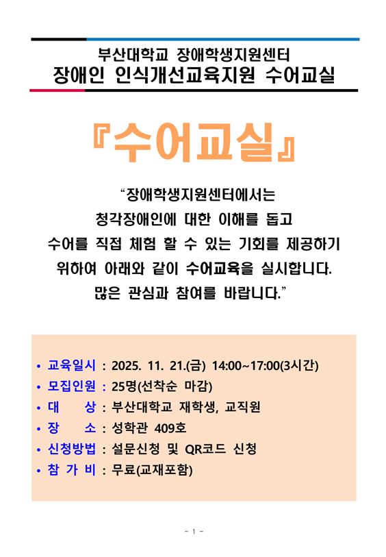 fnctId=bbs,fnctNo=2186 작성일 2025.11.13 수정일 2025.11.13 작성자 치전원 관리자 조회수 21 [장애학생지원센터] 장애인 인식개선지원 수어교실 개최 안내 첨부파일 첨부파일이(가) 없습니다.