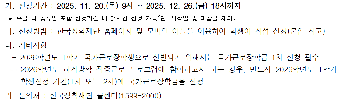 fnctId=bbs,fnctNo=2186 작성일 2025.11.18 수정일 2025.11.18 작성자 치전원 관리자 조회수 23 [장학_학부] 2026학년도 1학기 국가근로장학금 1차 신청 안내 첨부파일 2026년 1학기 1차 국가근로장학금 학생신청 방법(홈페이지).pdf 미리보기 2026년 1학기 1차 국가근로장학금 학생신청 방법(모바일).pdf 미리보기
